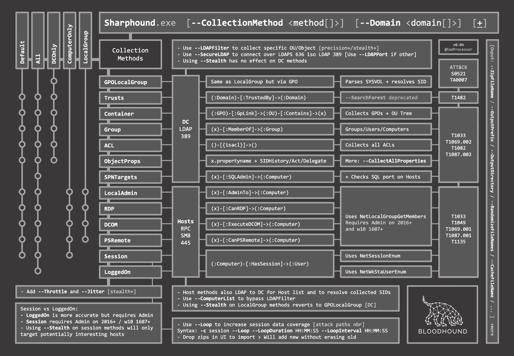 Cmd > SharpHound.exe [-d megacorp.local] [--LdapUsername snovvcrash] [--LdapPassword 'Passw0rd!'] -c DCOnly/All,GPOLocalGroup [--CollectAllProperties] --OutputDirectory C:\Windows\Temp [--MemCache/--CacheName ccache.bin] --ZipFileName backup.zip [--ZipPassword Passw0rd] [--RandomFilenames] --LdapPort 636 --SecureLdap --DisableCertVerification --SkipPortCheck --SkipPasswordCheck --ExcludeDCs --SkipRegistryLoggedOn [--Throttle 100] [--Jitter 20]